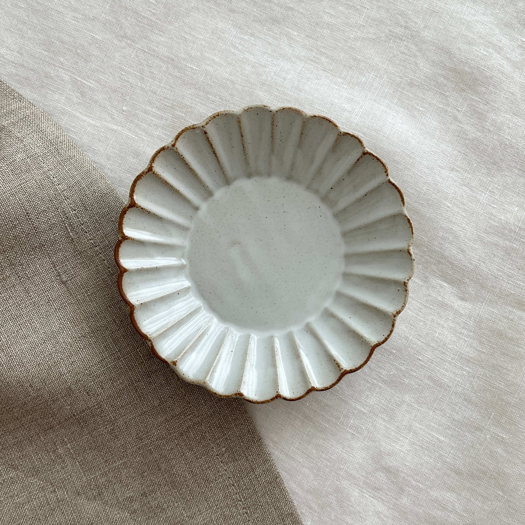 With the pottery material clearly highlighted on the base, a petal-like rim relief, and a playful design at the back, the plate instantly creates a sophisticated atmosphere.